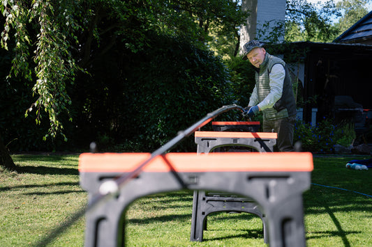 Wichtig ist, dass Sie bei der Arbeit, ganz gleich mit welchem Set, möglichst zwei Personen sind. Einer hält und arbeitet mit der Teleskoplanze, der zweite hat alles im Auge und rückt beispielsweise den Vorratsbehälter oder die Arbeitsböcke zum Ablegen der Telskoplanze immer in die passende Position.